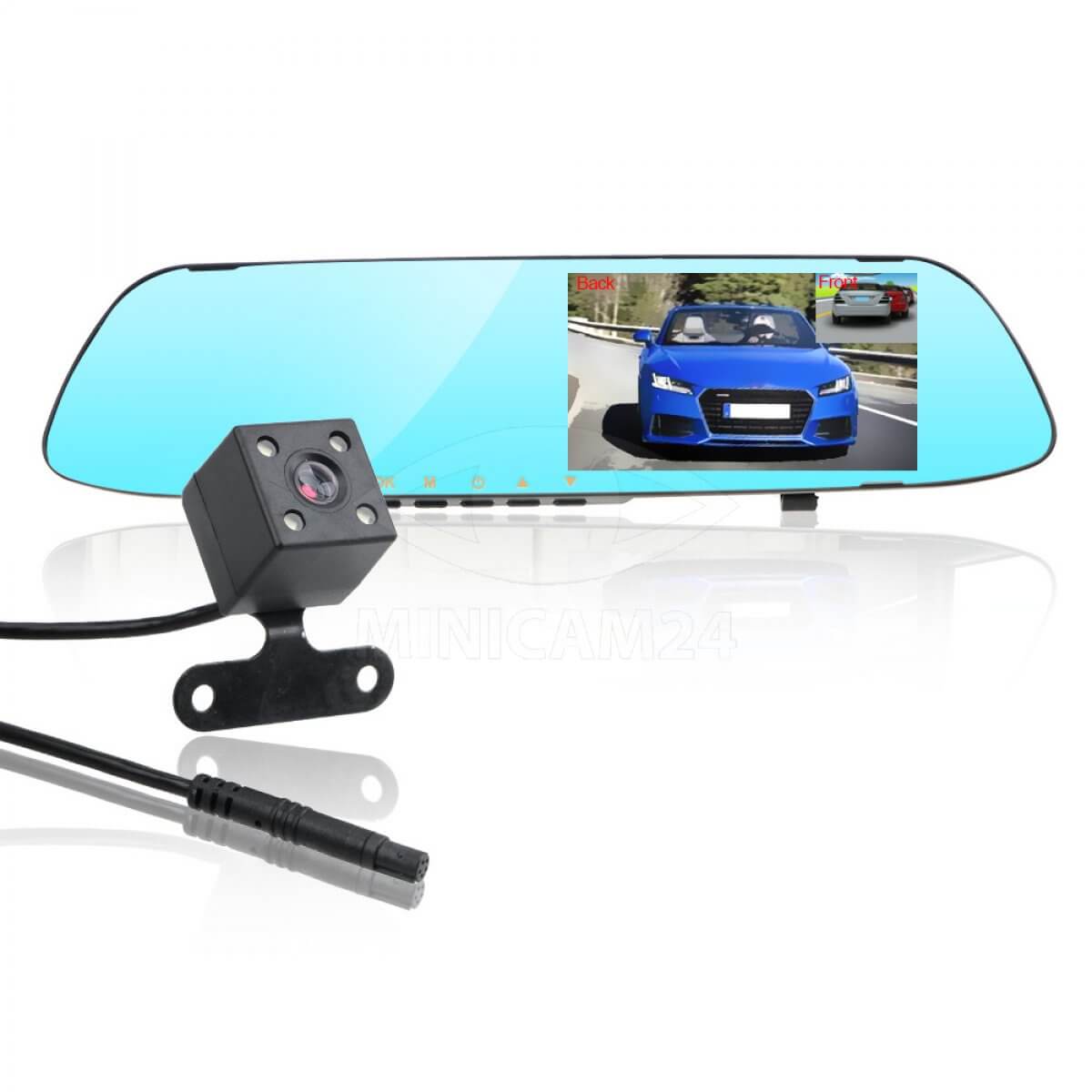 Видеорегистратор совмещающий функции салонного зеркала заднего вида с двумя видеокамерами с обзором в 170 градусов. Разрешение видео 1080Р. Камера заднего вида выводит изображение на сенсорный экран, встроенный в зеркало. Камеры оборудованы светодиодами инфракрасной подсветки для съемки ночью. Запись видео производится на карту памяти. Предусмотрена кольцевая запись. Питание от бортовой сети автомобиля.